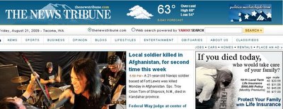 The actual article is titled, “Fort Lewis solider killed in Afghanistan.” And clarifies that two different soldiers were killed. Perhaps “Two local soldiers killed in Afghanistan this week” would have been a better on the front page. Or simply, “Local soldiers killed in Afghanistan.”