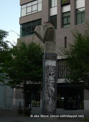 From 1948 to 1952, Greek immigrant and artist Tom E. Stefopoulos created a series of paintings on the columns of the old Lovejoy Ramp. The two columns in this plaza bear six of Tom’s original paintings, which will be restored by a professional conservator in the Spring and Summer of 2006. The photos you see here are full-scale images of the actual paintings underneath.
