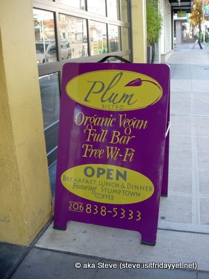 Plum Bistro, 1429 12th Ave., Seattle (Capitol Hill), 206-838-5333, http://plumbistroseattle.com/; opened in July 2009. Hours Sunday – Wednesday, 8am – 10pm, Thursday – Saturday, 8am – midnight. Street parking.