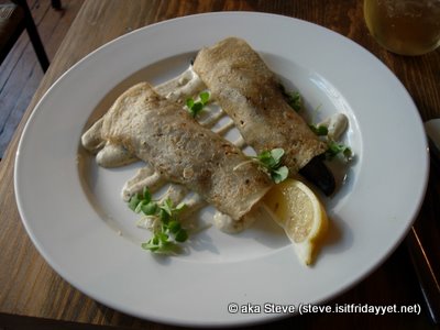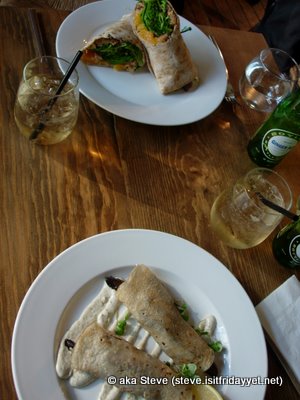 For our entrees, TB had the Spicy Jamaican Tempeh Wrap and I had the Smoked Northwest Portobello and Tempeh Crepes. For dessert, TB had the Strawberry Crepe. For drinks, we each had a Boylan ginger ale.
