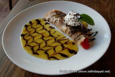 The dessert crepe was light and sweet – fresh strawberries topped with chocolate and whipped cream, accompanied by a caramel sauce.